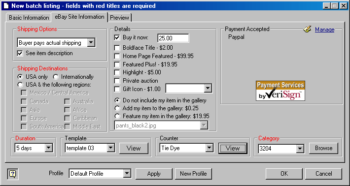 The second tab is for information needed by the specific site you chose. Click on this tab to enter the site-specific information such as payment options and shipping terms. Required fields are labeled in red.