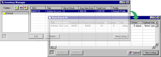 The inventory window looks very similar to the batch window. However, while you can create as many batches as you like, you have only one inventory. You enter listings into the inventory much the same as you enter listings in a batch. You click New Item in the lower right of the window and enter the details. You can add an inventory listing to a batch by dragging it from the inventory to a batch window. You will notice that dragging a listing from the inventory into a batch doesn't cause it to be removed from the inventory. It stays in the inventory so you can have a record of it, and you can edit that record to show when it was sold, the price and other details. |