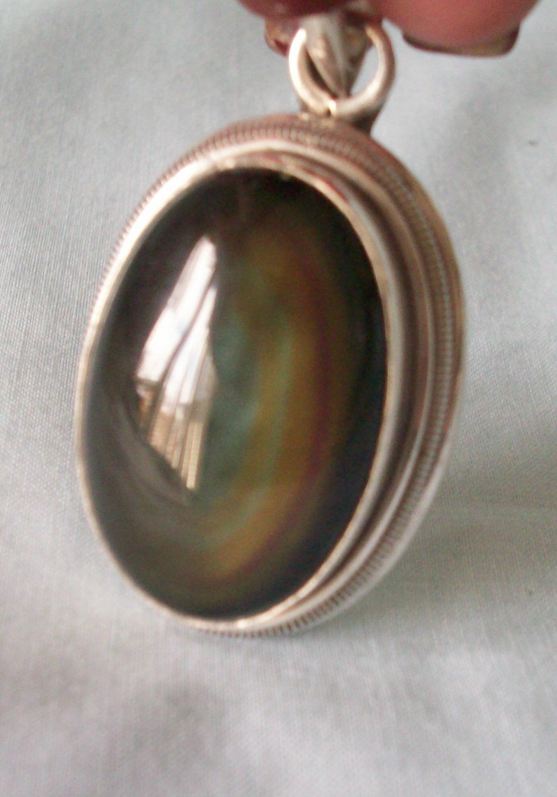 Rainbow obsidian is a translucent glassy black most of the time, but flashes rainbow colors as it moves in the light. This particular stone has green and aqua curved stripes.