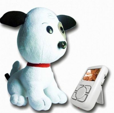 This cute new plush dog is just the nanny camera you are looking for. Featuring the ability to transmit audio and color video wirelessly over a 2.4 GHz signal you can tuck it away anywhere, even in plain view, to keep an eye on your little ones. Tuck the stuffed dog in with your child's other toys and plush toys and no one will ever give it a second look even though its nose is actually a camera lens. This unit makes a perfect Baby Monitor, giving your child a more comforting face than your bland every day baby monitor and the unit can easily be expanded to a more fully featured system down the road.