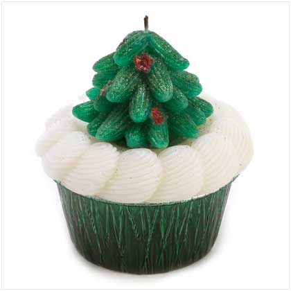 Christmas Tree Cupcake Candle Your holiday dream of sugarplums just came true! Clever cupcake candle looks and smells just like a tempting holiday treat, adding a festive glow to any celebration. Candy cane fragrance. Burns up to 35 hours.Weight 0.4 lb. 3 1/4" diameter x 3 3/4" high. Paraffin wax and tin foil.
