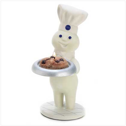 Pillsbury Doughboy Candle Set Clever candle has the luscious look and scent of a fresh-baked chocolate chip cookie, proudly presented by the Pillsbury Doughboy himself. A kitchen keepsake that’s chock full of wholesome charm! Weight 1 lb. Ceramic with paraffin wax candle. 3" x 4 3/4" x 6 3/4" high; cookie candle is 1 7/8" diameter x 3/8" thick. Set
