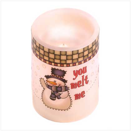 Snowman Flameless Candle Melt the hearts of all who behold this charming lifelike LED candle! A peppy holiday theme is perfectly backlit by the lifelike glow of this flameless decoration; the perfect choice around children, pets and heavy household traffic. Unscented. On/off switcWeight 0.4 lb. 3" diameter x 4" high. Paraffin wax, plastic and LED light. Three AAA batteries not included.