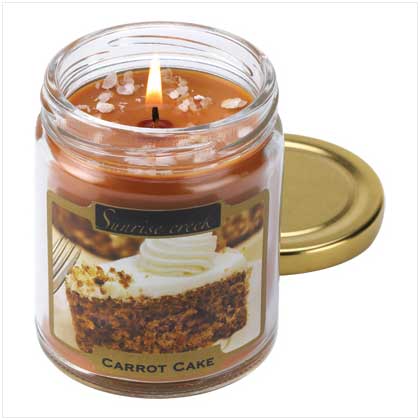 Carrot Cake Scent Candle Enjoy your favorite dessert without adding inches to your waist! Highly fragranced jar candle bears the luscious scent of rich carrot cake for a calorie-free indulgence. Burns up to 45 hours. 7.3 oz. Made in USA. Soy blend wax with glass lidded jar. 2 3/4" diameter x 3 1/2" high.