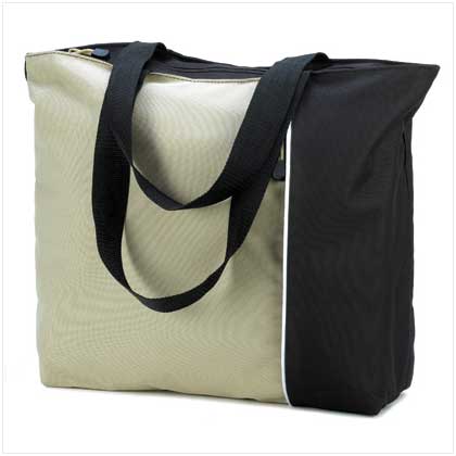Black And Tan Shoulder Tote Whether it’s the grocery store, gym, work or school, this extra-large tote is the perfect companion! Understated khaki and black scheme is stylish in any situation; zippered compartments provide roomy storage on the go. Weight 0.4 lb. Canvas fabric. 19 3/4" x 5" x 15" high; 26 1/2" high with straps.
