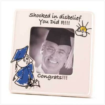 Shocked Face Graduate Frame Cute cartoon graduate gazes in amazement at the photo of your loved one’s accomplishment; the caption proclaims his disbelief. A quaint way to quietly show your pride! Holds 3” x 3” photo. Easel back. Dolomite frame; plastic cover. 5 1/8" x 5 1/8" high.