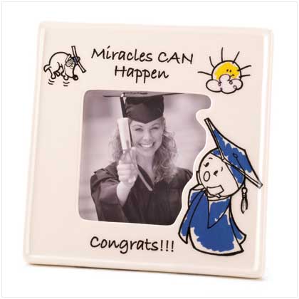 Surprised Face Graduate Frame Funny-faced graduate can’t control his surprise; your favorite student made it all the way through! Humorous photo frame gives a gentle nudge to your loved one on his or her proudest day. Holds 3” x 3” photo. Easel back. Dolomite frame; plastic cover. 5 1/8" x 5 1/8" high.