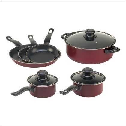 9 Pc. Cookware Set Whether it’s a quick snack or a full-fledged feast, this fabulous cookware prepares your meal with ease! Lidded pots and pans feature non-stick lining for fast cleanup; rich burgundy finish adds an extra touch of elegance. Set includes two saucepans and one pot with lids and three pans. Weight 5.5 lbs. Carbon steel with heat insulated handles. Hand wash only. Three size pots (1.5, 2, 8 quart); three sized pans (6 1/4", 7 3/4", 10" diameter each). Set of 9