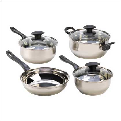 Culinary Essentials Cookware Good meals start with quality cookware, and this 7-piece set contains everything you need to prepare a gourmet feast! A full array of pots and pans, complete with lids, makes cooking easy and fun. Set includes three assorted-size saucepans; one deep skillet; three fitted lids. Weight 6.4 lbs. Stainless steel with Bakelite handles and tempered glass lids. Dishwasher safe. Two saucepans with lids (1.6 & 2.2 quart), 3.2 quart pot with lid; pan: 8 1/2" diameter x 2 1/8" deep. Set of 7