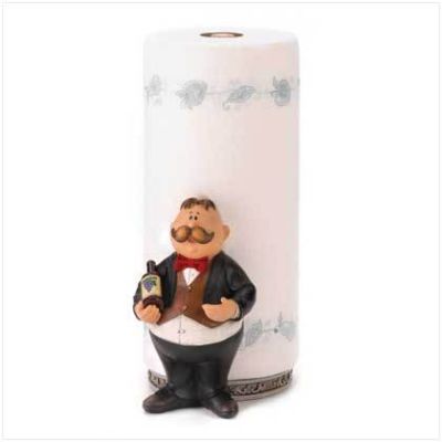 Cute Waiter Paper Towel Holder Plump wine steward keeps your paper towels within easy reach, while holding his favorite vintage at the ready. A lovable light-hearted touch for any gourmet kitchen! Polyresin with wood spindle. Paper towel not included. 7 1/8" x 4 3/4" x 11" high.