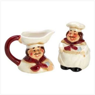Le Chef Sugar And Creamer Impeccably dressed miniature chefs add a gourmet flair to your next coffee break! Whimsical sugar and creamer containers are the ideal companions to your well-set table. Weight 1.2 lbs. Dolomite. Dishwasher safe. Not microwave safe. Sugar container: 3 1/4" x 3 3/8" x 5" high; creamer: 5 1/4" x 3 1/2" x 4" high. The following is provided in compliance with California law Prop. 65: WARNING: This product contains a chemical known to the State of California to cause cancer and reproductive toxicity