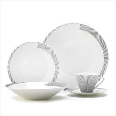 Tuxedo Stripe Dinnerware Set Contemporary dinnerware set features a playful black and white striped rim and sleek, modern shaping. An understated ensemble that makes any meal into a celebration of style! Includes serving set for 4: dinner plate, soup plate, salad plate, cup and saucer. Weight 18.6 lbs. Ceramic. Microwave and dishwasher safe. Dinner plate: 10 3/4" diameter; salad plate: 7 7/8" diameter; soup bowl: 9" diameter; cup: holds 4 oz.; saucer: 6" diameter. Set. The following is provided in compliance with California law Prop. 65: WARNING: This product contains a chemical known to the State of California to cause cancer and reproductive toxicity.