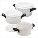 Microwave Cooking Pots Prepare a plentiful meal in mere minutes! Generously sized containers are made to handle a variety of microwave cooking chores; snap-on lids keep leftovers nice and fresh. 3 bowls with lids (6 pieces total). Plastic. Microwave and dishwasher safe. 2.8 liter: 8 1/4" diameter x 4 1/2" high; 1. 7 liter: 7" diameter x 3 3/4" high; 1.0 liter: 6" diameter x 3" high. Set