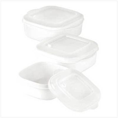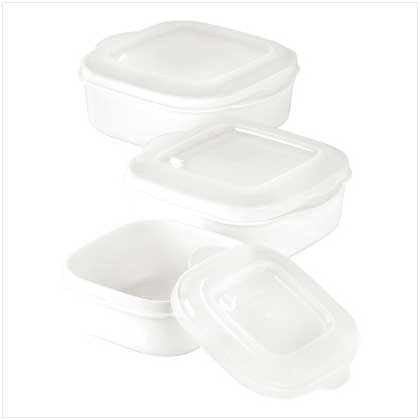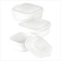 Microwaveable Bowl Set Enjoy fresh, delicious food in a flash with these handy lidded microwave containers! Perfect for leftovers or lunch on the go, these vented cookers quickly heat your favorite meals. Three containers with vented lids (6 pieces total). Plastic. Microwave and dishwasher safe. 1.5 liter: 7" diameter x 2 3/4" high; 1.2 liter: 6 1/4" diameter x 2 1/2" high; 0. 6 liter: 5" diameter x 2" high. Set