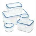 10 Pc Storage Container Set Organization is easy with this handy set of clever containers, sized just right for any storage need! Clear-plastic boxes feature quick-snap lids for effortless closing and a sure seal. Ideal for keeping your favorite foods farm-fresh; also great for holding small items right at hand! Includes five containers and five lids. Plastic. Hand wash. Largest: 8" x 5" x 3 1/2" high. Two medium size containers: 6" x 3 3/4" x 2 1/4" high. Two small containers: 3 1/4" diameter x 1 3/4" high. Set