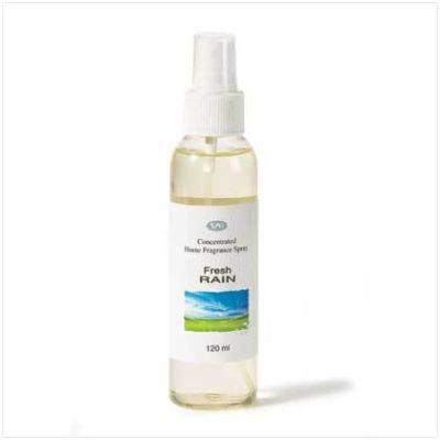 Fresh Rain Home Fragrance Spray Enhance your surrounding with an instant burst of pleasing fragrance with this sumptuous room spray. Clean scent of fresh rains is 120ml of perfume oil and water. 1 1/2" diameter x 6 1/2" high.
