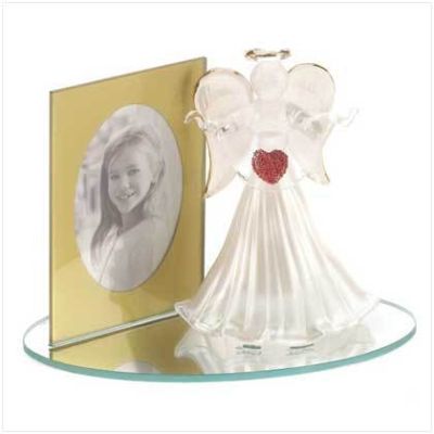 Angelic Love Photo Frame Proudly showcase your favorite family photo, with a very special guardian angel to keep your loved ones company! Crystal-clear and frosted glass receives a heavenly twinkle from gleaming gold trim and a heart that glitters with love. Holds a 1 3/4" x 2" photo. Weight 0.1 lb. Glass with mirror base. 4 3/4" x 2 5/8" x 3 5/8" high.