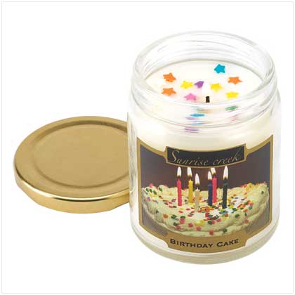 Birthday Cake Scent Candle Highly scented jar candle bears the mouth-watering fragrance of fresh-baked frosted cake, taking you back in time to the magical birthday celebrations of your childhood. Brings back the very best of life’s memories! 45 hours burn time. 7. 3 ounce. Made in the U.S.A. Soy blend wax with glass lidded jar. 2 3/4" diameter x 3 1/2" high.