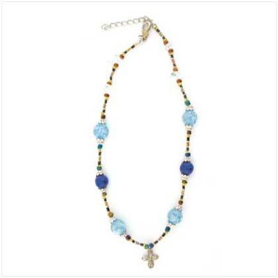 Coastal Blue Sundance Choker A single strand of glowing glass beads recalls the delicate beauty of morning dewdrops; such a flattering and feminine finish to any outfit! Weight 0.1 lb. Glass, acrylic beads and metal cross charm. 16" long; adjust to 18" long.
