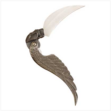 Demon's Wing Pocket Knife Send a shiver down your spine every time you whip out this menacing pocket knife! A sneering skull bids a chilling warning above a wing-shaped sheath and wickedly curved blade. Weight 0.1 lb. Zinc alloy handle; stainless steel blade. Closed: 5/8" x 1 1/8" x 4" long; 7" long when open.