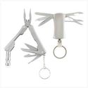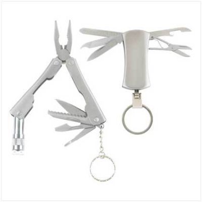 Executive Tool Gift Set Sleek, stylish keychain tools fit elegance and utility together at last! Brushed metal keychain duo includes a handsome knife and multi function tool in a custom case. A great gift for any man of style and substance! Multi tool keychain includes: led light, pliers, wire cutter, flat screwdriver, knife, saw, philips screwdriver and can opener. Pocket knife keychain includes: scissors, bottle opener, knife, ruler, and nail file. Stainless steel. Set: 5" x 5 3/4" x 1" high; multi tool keychain(closed): 1 1/8" x 1/2" x 4 3/4" high; pocket knife keychain: 1" x 3/8" x 3 7/8" high. Set