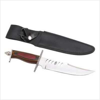 Hunting Knife Be the envy of everyone when you draw this mighty hunting knife! An intriguing combination of beauty and function, with an exotic rainbow wood grip and stainless steel blade. Perfectly balanced for a secure hand grip. An impressive— and utterly indispensable— tool! Leather sheath included. Stainless steel with wood. 3 1/2" x 1/4" x 12 3/4" long.