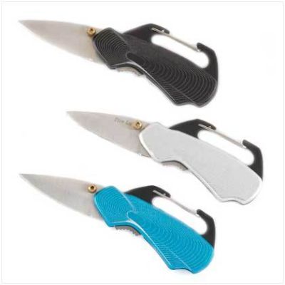 Mini Clip-on Knife Trio Clip these nifty little pocket knives just about anywhere and have a handy blade right at ready reach! Colorful case with carabiner style clip attaches instantly to belt, pocket or shoulder strap for easy access. Includes one each in black, blue and silver metallic designs. Weight 0.1 lb. Stainless steel blade with aluminum handle. Each is 2 1/2" x 1 1/4" x 1/4" thick; 4" long when open. Set