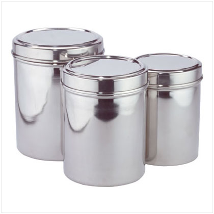 Stainless steel canisters keep food fresh longer and make handsome decorations for any modern kitchen counter. Dishwasher safe. Largest measures 5 1/4" diameter x 6 3/4" high.