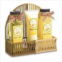 Vanilla Caramel Bath Set This scrumptious trio of bathtime favorites features the fabulous fragrance of a decadent dessert! Satisfy your sweet tooth in a whole new way as you treat your skin to a smoothing, soothing spa experience in luscious Vanilla Latte Caramel Popcorn Cookie scent. Set includes 220ml shower gel; 220ml bubble bath; 130ml body lotion, all prettily packaged in a basketweave tray. 7 1/2" x 2 3/4" x 7 1/4" high.