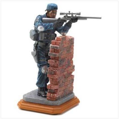 Police Perfect Position Figurine As he takes careful aim at his assigned target, an elite sharpshooter becomes the very embodiment of calm under pressure. Captured in action in a stunning figurine so lifelike, you’ll almost see him breathe! Limited edition of Blue Hats of Bravery™ by Vanmark®. Handcrafted. Weight 2.5 lbs. Resin with wooden base. 4 3/4" x 7" x 9 3/4" high.