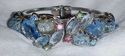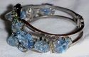 This pretty bracelet is in very good condition. There are no chipped, cracked, scratched, missing or replaced stones. There are many sizes, shapes and textures plus a couple of pink and green accent stones. They all are securely set. The silvertone finish is nice and shiny too. At the front it is 1" wide and at the hinge, 3/8". The opening is 2 1/4" by 1 7/8" across. The hinge is as snappy as new with no play n it at all. If you have any questions, please do not hesitate to ask. The winning bidder is to pay 1.75 for 1st Class shipping in a well padded envelope after having been wrapped in tissue and bubble, plus insurance if desired. That amount includes delivery confirmation and I never charge a handling fee. Thank You !!!