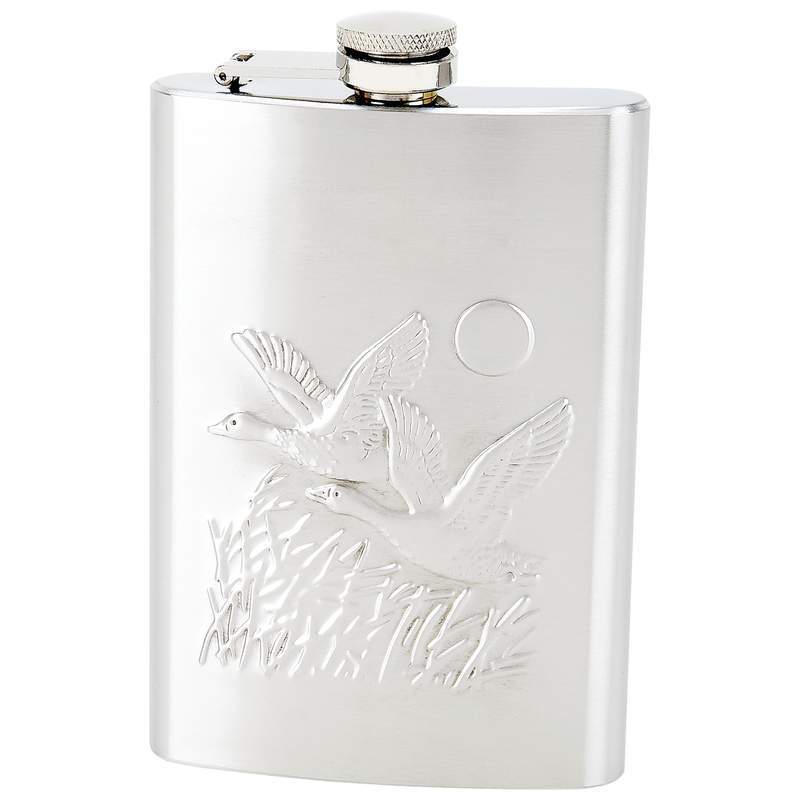 Maxam stainless steel flasks provide sleek, sturdy containment and transportation for your spirit of choice. Features embossed duck scene, polished finish and screw down cap. Measures 3-3/4" x 5-1/4". Limited lifetime warranty. White box.