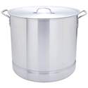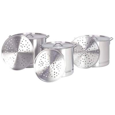 Set includes: 60qt covered stockpot with steamer rack, 80qt covered stockpot with steamer rack and 100qt covered stockpot with steamer rack. All feature riveted handles and high quality aluminum construction. .