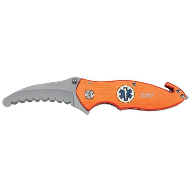 Features stainless steel serrated blade, anodized aluminum handle with EMT badge, seatbelt cutter, glass breaker, thumbstud, and clip. Measures 4-3/4” closed, 7-3/4” open. Gift boxed.