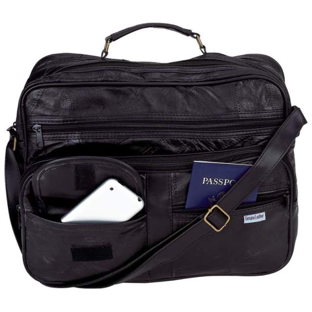 Features a pocket on the front for a phone, passport, keys and the zippered pocket in the front for money or small wallet. It also has a large, zippered front pocket for wallet or camera and there is another zippered pocket in the front for magazines or papers. There’s also a large pocket for clothes or other essentials. Finally, on the back is still another pocket for files or papers with pen caddies and business card holders. It also features a padded handle and adjustable shoulder strap. Measures 14" x 10-3/4" x 6".