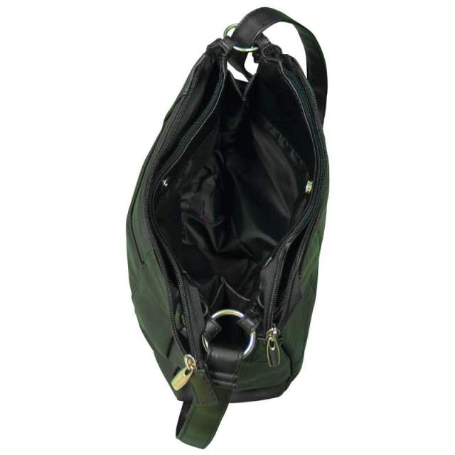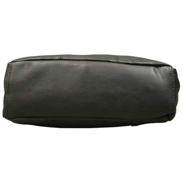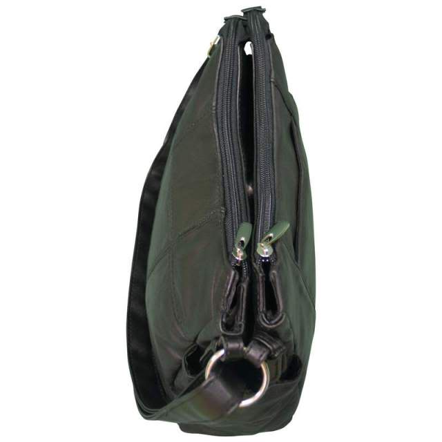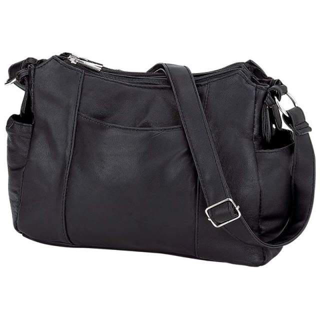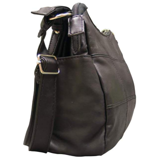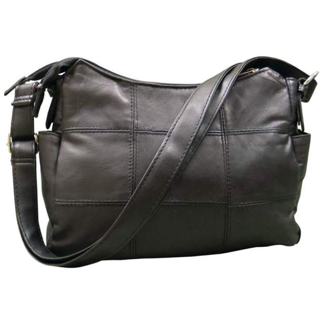 Features multiple pockets, compartment with snap closure, 2 zippered compartments, zippered privacy pocket, cell phone holder, and adjustable shoulder strap. Measures 11-1/8” x 8-1/2” x 3-3/4”.