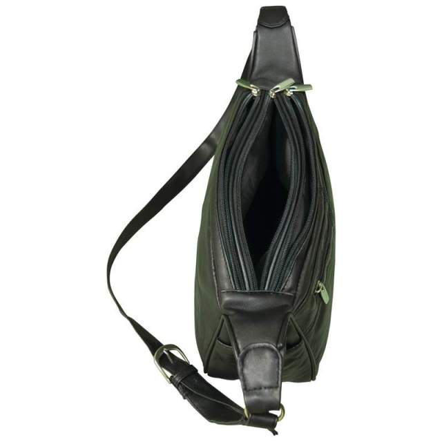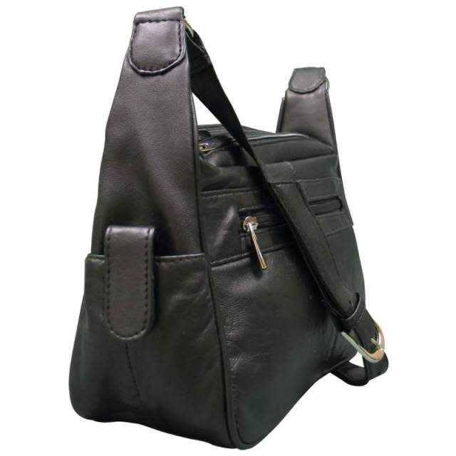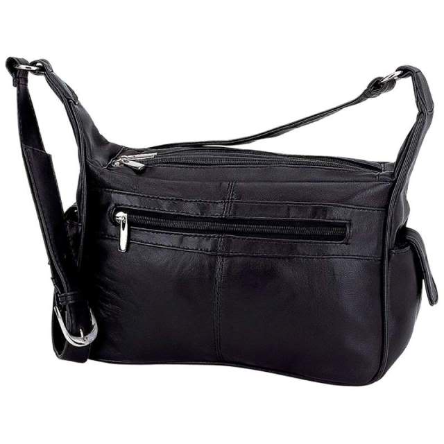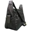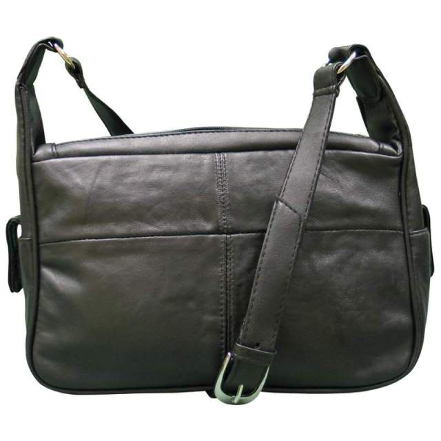 Features multiple pockets, 3 zippered compartments, multiple interior pockets including a zippered privacy pocket, and an adjustable shoulder strap. Measures 11” x 6-1/2” x 4-3/8”.