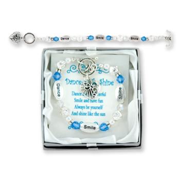 "The Kid's Size Bracelet that says it all! This Expressively Yours Childrens bracelet features three beads, each with a Sterling Silver finish and engraved with one of the words: ""Dance"" ""Smile"" ""Shine"". The dangling Heart charm has a beautiful cut out design. Bracelets are individually gift boxed with a verse card inside which reads: ""Dance and be cheerful, Smile and have fun, always be yourself, and Shine like the sun"" Lead Free " Case Pack 3