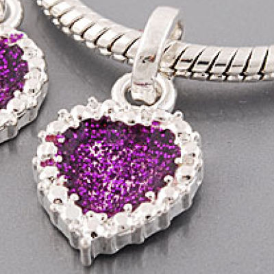 GLITTERED PURPLE HEART DROP CHARM BRACELET BEAD #958