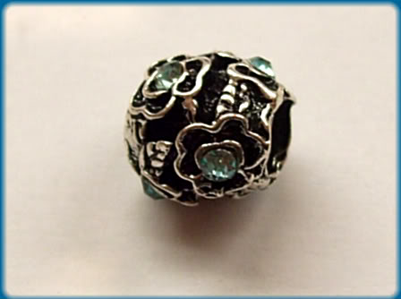 Abalorio Bola con Motivos de Flores Baño en Plata con Cristales de Azules.