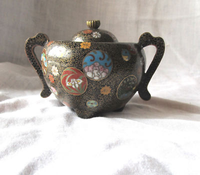 THIS IS A RARE AND UNUSUAL SHAPED KOGO OR INCENSE CONTAINER. IT IS A SQUAT SHAPE WITH HANDLES THAT ARE DECORATED WITH CLOISONNE AS WELL AS THE BODY. THE CAP IS DECORATED WITH CLOISONNE AND A BRASS LOTUS KNOB IT RESTS ON 3 TINY FEET. THE BODY AND CAPE IS DECORATED WITH A BEAUTIFULLY WORKED DESIGN OF GEOMETRIC FIGURES AND FLOWERS ALL WORKED IN VERY FINE DETAIL AND IN VERY FINE PRECISE WIREWORK