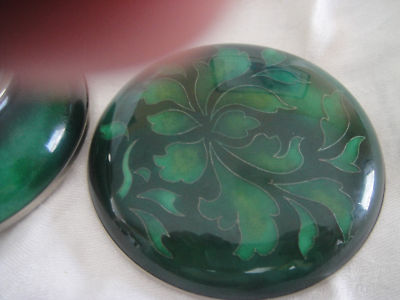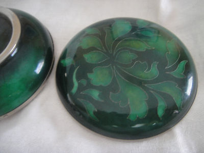Beautiful Japanese Silverwire Cloisonne Box Delicate leaves in shades of lighter green that are outlined with silver wire on a darker green background. Very artistic asymmetric design. The rims are silver or silverplate. The bottom rim is marked with the Maltese cross mark of Ando The insides of box and cover are lined with hunter green velvet.