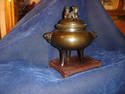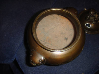 A very fine piece of Asian decorative art used as an incense burner of primarily bronze. The globular body sits on 3 delicate sturdy legs. The center of the front is inlaid with a gold flower aind lines of leaves and vines on either side. At each side is a shishi head which serve as handles. The cover (a separate piece) has tril-lobe openisngs.for the incense smoke A full-figure shishi (like a foo lion or dog) sits atop the cove with its paw on a ball.