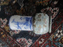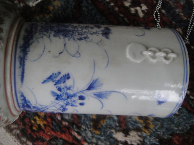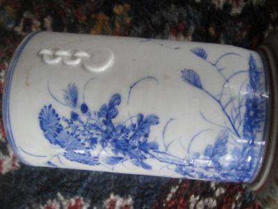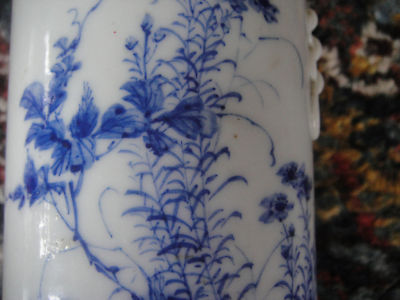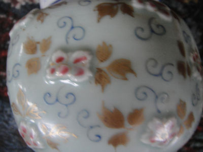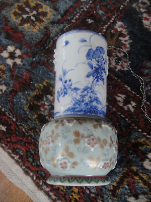 Super nice Japanese Imari celadon vase. The bulbous bottom part is light green celadon with mainly pink raised flower designs with painted gold leaves. This narrows down to a straight globular part that has white background with beautiful blue paintings of flowers and bushes on two sides of vase. In between these paintings are raised designs depicting handles. the vase is 8-1/2 inches high 4 inches at widest 3 -1/2 inches at base It is signed with a painted on mark on an open book. There are also Kanji marks that are impressed but very hard to read. It is in excellent condition and has been in my own collection for about 30 years. I will be happy to answer any questions or to provide additional photos. Thank you for your interest.