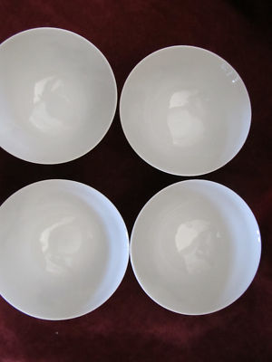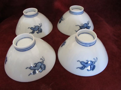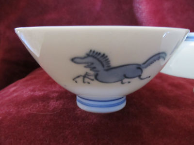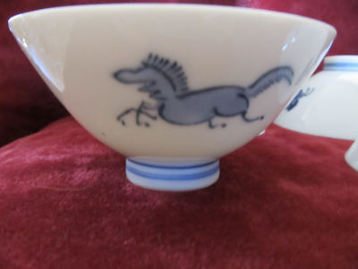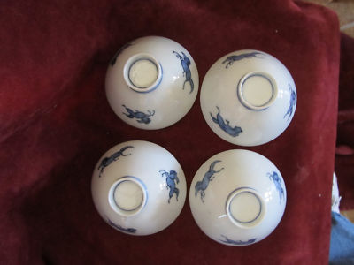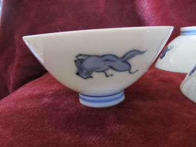 Very delicate translucent white porcelain rice bowls Each bowl has 3 figures of a horse painted on the outside The horse is in 3 different postures on each bowl Band of blue are near the base of the bowls the bowls have glazed distinct raised foot rim The bowls are 4-1/2 inches wide by 2-1/2 high or 11-1/2 cm by 6-1/4 cm They are all in mint condition There are no marks but are probably from around 1900 Very nice