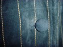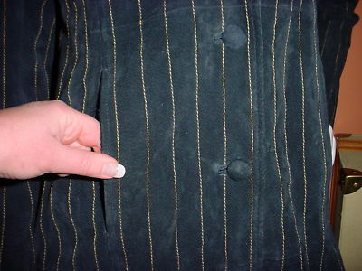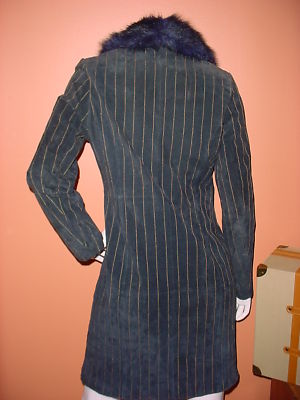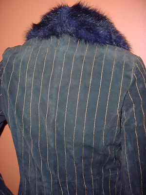 Very FEMININE ! Blue color with yellow stripes , genuine Leather/ Suede .Front buttons closure, 2 pockets on the front,fully lined. Excellent vintage condition.