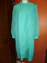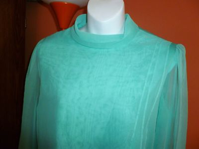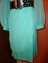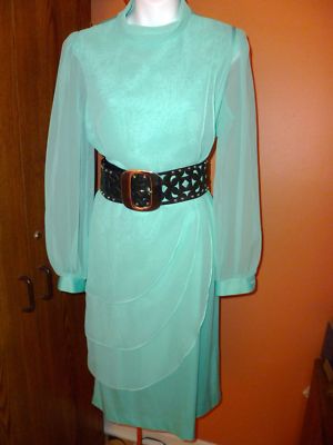BEAUTIFUL Light Turquoise color ,3 layers chiffon overlay in the front,illusion puffy sleeves , long back zipper . Belt NOT included. Good vintage condition.