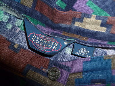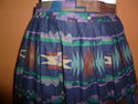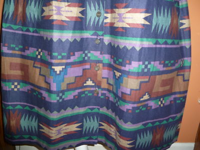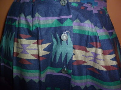 This is an absolutely stunning Indian Blanket pattern , metal buttons front closure, 2 hidden pockets on the sides. Pleats at the waist band. Made in USA of 100 % Cotton imported . Great vintage condition.