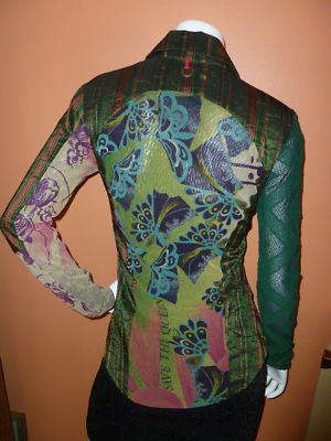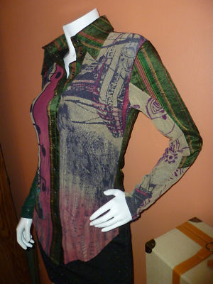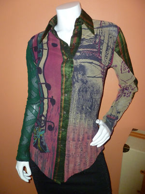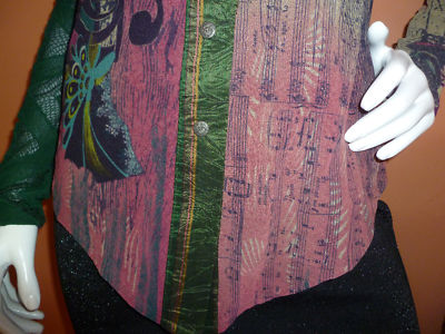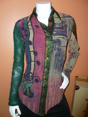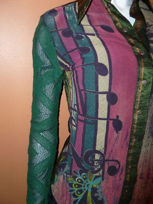 Mesh fabric in RARE Musical signs/ notes print , multi -colors , signature on the fabric, fully lined with black mesh fabric, snaps front closure. Been gently worn ones, excellent condition .