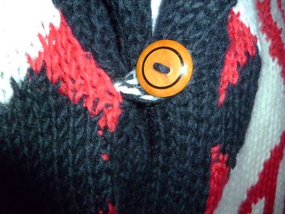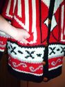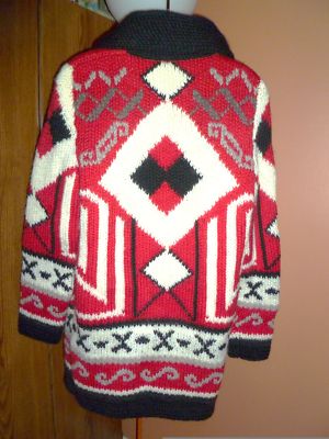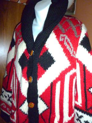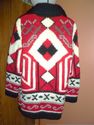 Exclusive HAND KNIT in Mexico by Angela Rose from SOFTEST 100 % pure new WOOL ( from New Zealand Perrendale baby lambswool ) ! Indian blanket pattern , black, red, white, grey colors , wooden buttons front closure.Style # 7506.